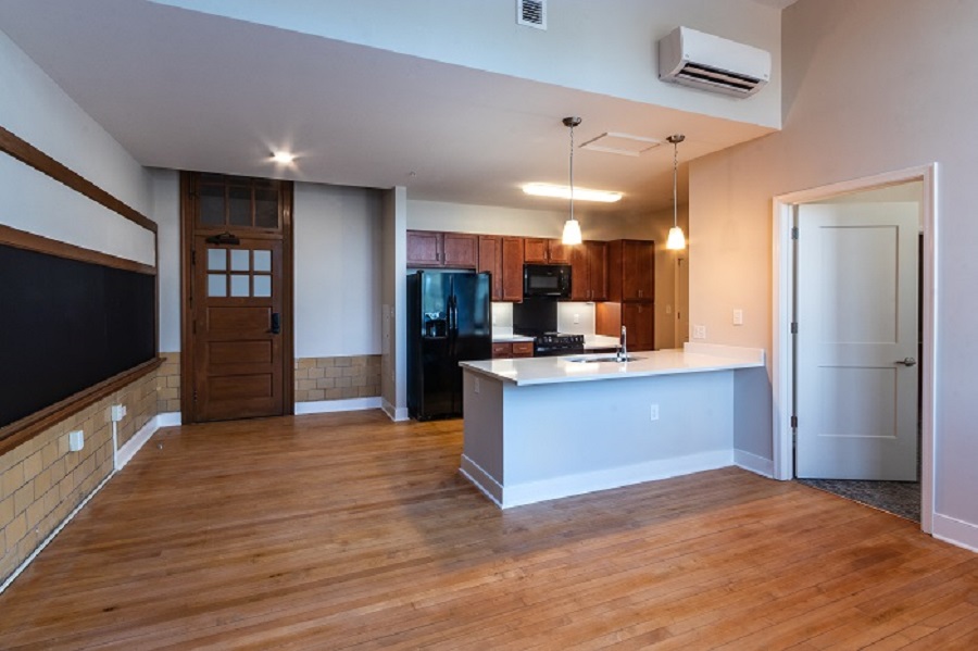 Enterprise Community Development worked with RRHA to acquire the property and transform the building into needed affordable housing. Individual classrooms were converted into large one-bedroom units, many of which featured built-in closets and cupboards that have been incorporated into the bedrooms as well as a large chalkboard in the new living rooms or kitchens.