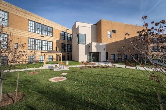 The homes, which target seniors earning no more than 50% and 60% of the area median income, are fitted with Universal Design features, ensuring that residents can age in place. The cafeteria and gymnasium retain their common purposes, now home to a large common room with a catering kitchen, laundry facilities, a program office, a business center and café, and a fitness center.