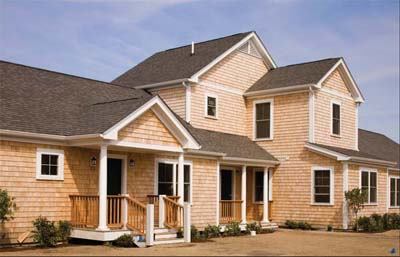 Modular housing systems are limited with respect to design and aesthetics. Winslow Design Associates of Cambridge, Mass., designed our homes to look more like traditional structures than much of the manufactured housing on the market today. Wood clapboards and weathered shingles clad the exterior of the buildings, and grand family porches and individual entryways make each unit look and feel like a single-family home. Innovative disguised-density techniques allow each building to house between two and four residential units, styled on a variety of traditional New England structures. All the buildings are generously set back from environmentally sensitive areas.