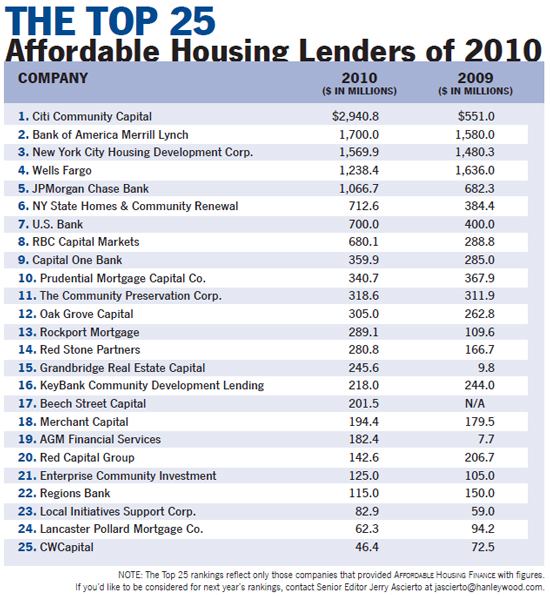 Most of the lenders on the Top 25 list saw a marked improvement last year. But the award for comeback player of the year has to go to Citi Community Capital. Citi regained the mantle of top affordable housing lender, improving from $551 million in 2009 to nearly $3 billion in 2010 in a dramatic reversal of fortune.