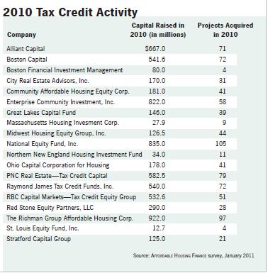 NEF reported raising $835 million in 2010, a record for the 23-year-old Chicago-based syndicator. Midwest Housing Equity Group, Inc. (MHEG), also posted its best year, raising $126.5 million and acquiring 44 projects. Red Stone Equity Partners, LLC, said its investor closings were up more than 75 percent from the year before. Enterprise Community Investment, Inc., reported that its 2010 production was up more than 70 percent from 2009. And, Community Affordable Housing Equity Corp. said it had its most productive year at both the upper and lower tiers.