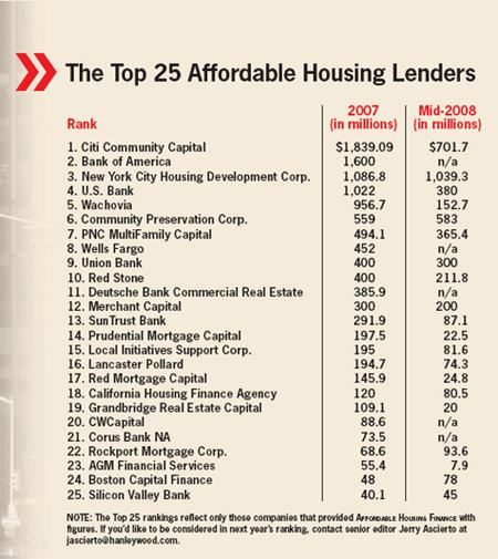 A few regional lenders also topped this year’s rankings. The New York City Housing Development Corp. (NYCHDC) doled out more than $1 billion in 2007 and was well ahead of that pace by midyear 2008. The Community Preservation Corp., which lends to preservation deals in New York, New Jersey, and Connecticut, entered the rankings for the first time, originating $559 million in 2007 and surpassing that amount by mid-2008.