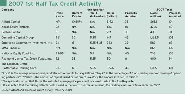 The price per dollar of credit averaged about 93 cents in the fourth quarter of 2007, according to an AFFORDABLE HOUSING FINANCE survey of LIHTC syndicators. That’s a notable fall from the nearly 97 cents average reported a year earlier, and prices were expected to drop further. Yields were in the 5.3 percent range in the fourth quarter and climbing.