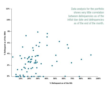 So, our next step (and current activity) is to also add a proactive adjustment to our system. For example, our data analysis shows very little connection (or correlation) between delinquencies as of the initial due date and delinquencies as of the end of the month (see chart). This is leading us to look at a variety of issues including our resident selection criteria. We are interviewing potential information providers as we work to build our own proprietary screening methodology using advanced statistical analysis to estimate the probability of late payment. This step is where our form of asset management is moving from traditional rules of thumb, industry standards, and “best practices” to hard-core data analysis that creates a proprietary competitive advantage that is specific to our portfolio, residents, and communities.
