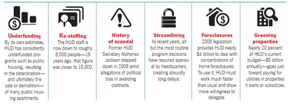 Though no one expects a flood of new funding for HUD, Obama has promised some additional resources. “I know that the department needs resources to successfully implement the expansion of programs required by the Housing and Economic Recovery Act of 2008,” Obama said. “I pledge to work with Congress to secure resources necessary to meet HUD’s important mission.”