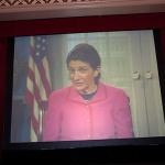 Sen. Olympia Snowe addresses the luncheon audience via video.
