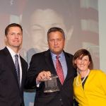 Bob Moss (center), senior vice president of Boston Capital, accepts Sen. Olympia Snowe’s award on her behalf from Christine Serlin, executive editor of Affordable Housing Finance, and David Leopold, senior vice president of Bank of America Merrill Lynch.