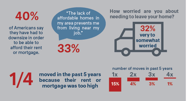In the survey of 1,006 people conducted this year, 23% reported having to move at least once in the past five years because their rent or mortgage was too high.