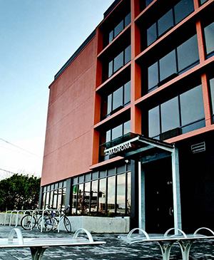 Three types of affordable housing are found at Madrona Studios. On the second floor, there are 44 alcohol- and drug-free units. On the third through fifth floors, there are 36 units of permanent supportive housing for formerly homeless individuals or couples. The top three floors also have studio apartments that provide workforce housing for low-income residents who are able to be more independent.