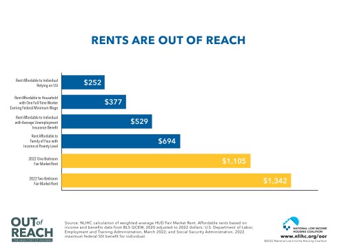 In its “Out of Reach 2022: The High Cost of Housing” report, the NLIHC highlights the mismatch between actual wages and what people need to earn to afford their housing costs. The annual report finds again this year that there is no county, metro area, or state where a person earning the federal or prevailing state or local minimum wage for a 40-hour work week can afford a modest two-bedroom rental home. These workers can only afford modest one-bedroom apartments in 9% of U.S. counties—274 out of more than 3,000 nationwide.