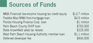 Additional financing for MerryPlace included $13 million in low-income housing tax credit equity syndicated by MMA Financial. The credits were allocated by the Florida Housing Finance Corp., which also provided a $1 million loan. The city of West Palm Beach funded critical infrastructure improvements for the new development.