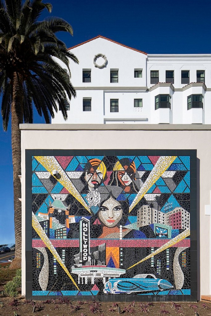 Artist Roberto Biaggi of Robi Design + Build was brought in to create a mural that captures the glamour of old Hollywood. Named “Overlooking the City,” the mural is made out of broken ceramic tile pieces and features the Castle Argyle as part of the city scene. “It’s like a little movie inside a movie,” says Biaggi, who also made it a point to be inclusive with different faces in the mural.