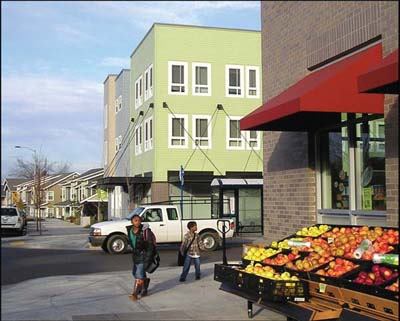 Main Street is a multi-use neighborhood center with apartments above the street-front stores and public buildings. The architecture draws on Portland’s Craftsman and Northwest housing styles.