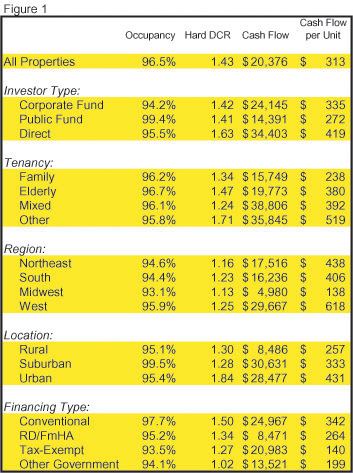 Data points covering the significant property operating performance characteristics were collected, including average occupancy, hard debt coverage, cash flow and cash flow per unit. Information was for calendar year 2000 and was based upon audited financial statements. A sampling of averages is shown on Figure 1 and suggests that the program is producing properties that in the aggregate, generate adequate levels of cash flow. Occupancy averages are high, and reported average hard-debt service coverage ratios are reasonable. We note, in this context, that cash flow and debt coverage data were calculated prior to required replacement reserve deposits.