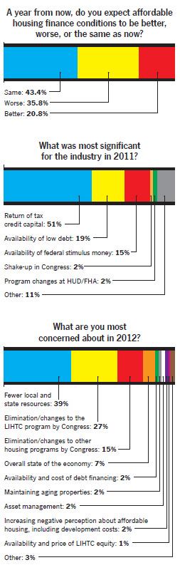 Asked to select their biggest concern for 2012, 39 percent of all developers surveyed said fewer local and state resources. Many of these developers work in California, where the state recently killed hundreds of local redevelopment agencies that funded affordable housing development. A number of other states also face severe budget deficits or other significant housing-related battles.