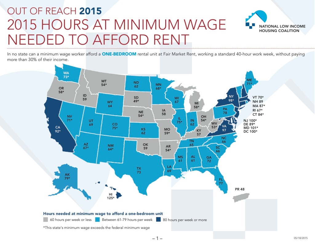 In 2015, an American household must earn $19.35 an hour, more than two and a half times the federal minimum wage, to afford a two-bedroom apartment without spending more than 30% of their income on rent. The national housing wage for a one-bedroom unit is $15.50.