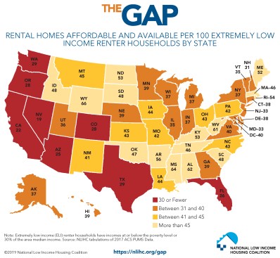 In its “The Gap: A Shortage of Affordable Homes 2019,” NLIHC says only 37 affordable and available homes exist for extremely low-income renters. These renter households also are more likely to be severely housing cost-burdened, spending more than half of their incomes on rent and utilities. According to the report, 7.8 million, or 71%, of the nation’s 11 million extremely low-income renter households fall into the severely housing cost-burdened category.