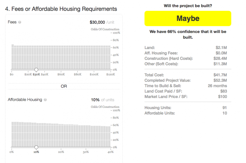 The dashboard features two tools. The first, a development calculator, shows how affordable housing requirements, local rents, and other factors influence the cost of development and estimates the probability that a project will be built.